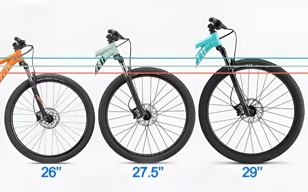 Bánh xe quyết định độ bám đường và khả năng di chuyển trên các loại địa hình khác nhau. Có 3 kích thước: 26 - 27.5 - 29. Trong đó, bánh 27.5” là loại phổ biến nhất và lời khuyên cho các bạn mới là nên ưu tiên loại này vì nó dễ đi và cân được tất cả các dạng địa hình.